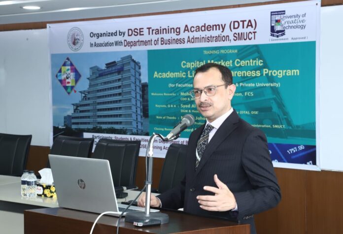 তার আগে পাবলিক ও প্রাইভেট ইউনিভার্টির শিক্ষক ও ছাত্রছাত্রীদের জন্য পুঁজিবাজার কেন্দ্রিক একাডেমী শিক্ষা ও সচেতনতামূলক ধারাবাহিক এই কর্মশালার শুরুতেই ডিএসই’র প্রধান প্রযুক্তি কর্মকর্তা ড. মো: আসিফুর রহমান সকলকে স্বাগত জানিয়ে বলেন, শিক্ষাথীরাই দেশের ভবিষ্যতে নেতৃত্ব দেবে৷ বর্তমান প্রযুক্তি নির্ভর বিশ্বে প্রযুক্তি ভিত্তিক মানবিক মানুষ তৈরিতে কলেজ বা বিশ্ববিদ্যালয়গুলোকে অগ্রণী ভুমিকা পালন করতে হবে। শিক্ষার্থীরা সবসময় নতুন কিছু শেখার প্রতি আগ্রহী থাকে৷ আর নতুনদের হাত ধরেই উন্মোচিত হয় সম্ভাবনার এক নতুন দিগন্ত৷ আজকের এ আয়োজন পুঁজিবাজারের তথ্য প্রযুক্তিসহ সামগ্রিক কার্যক্রম সম্পর্কে প্রাকটিক্যালভাবে জানার একটি বড় সুযোগ। বিশ্বজুড়ে পুঁজিবাজার এখন প্রযুক্তিনির্ভর। ডিএসইও এর ব্যতিক্রম নয়। আমরা প্রতিনিয়ত আমাদের ট্রেডিং প্ল্যাটফর্ম, ক্লিয়ারিং অ্যান্ড সেটেলমেন্ট সিস্টেম, সার্ভেইলেন্স ও সাইবার সিকিউরিটি ফ্রেমওয়ার্ক আরও উন্নত করার লক্ষ্যে কাজ করছি। প্রযুক্তির ব্যবহার কেবল লেনদেনের গতি ও নির্ভরযোগ্যতা নিশ্চিত করে না, এটি বাজারের স্বচ্ছতা ও বিনিয়োগকারীর আস্থাও বাড়ায়। আজকের এই প্রোগামে যা জানা যাবে তা বিশ্ববিদ্যালয়ের শিক্ষকদের জন্য যেমন কাজে আসবে, তেমনি ছাত্রছাত্রীদের জন্যও কাজে আসবে বলে আমি মনে করি।