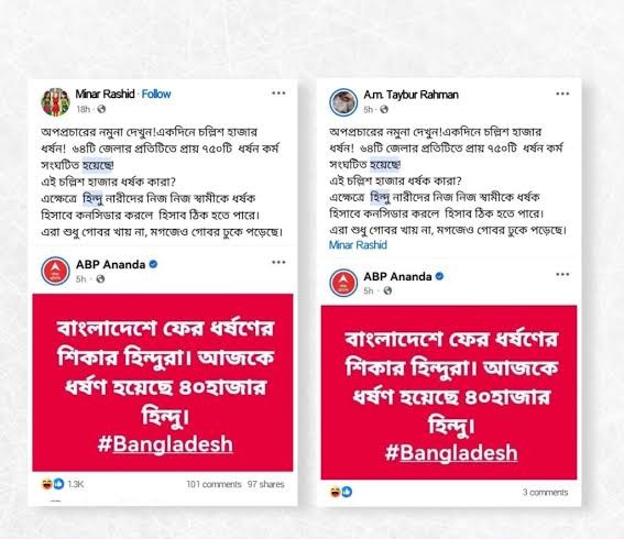 সামাজিক যোগাযোগমাধ্যমে ভারতীয় গণমাধ্যম এবিপি আনন্দের একটি ভুয়া স্ক্রিনশট ঘিরে বিতর্কের সৃষ্টি হয়েছে। স্ক্রিনশটটিতে দাবি করা হয়েছে, এবিপি আনন্দ ফেসবুকে “বাংলাদেশে ফের ধর্ষণের শিকার হিন্দুরা। আজকে ধর্ষণ হয়েছে ৪০ হাজার হিন্দু” শিরোনামে একটি পোস্ট করেছে। তবে ফ্যাক্টচেকিং প্ল্যাটফর্ম রিউমর স্ক্যানার বাংলাদেশ এই দাবি সম্পূর্ণ মিথ্যা ও ভুয়া বলে নিশ্চিত করেছে।