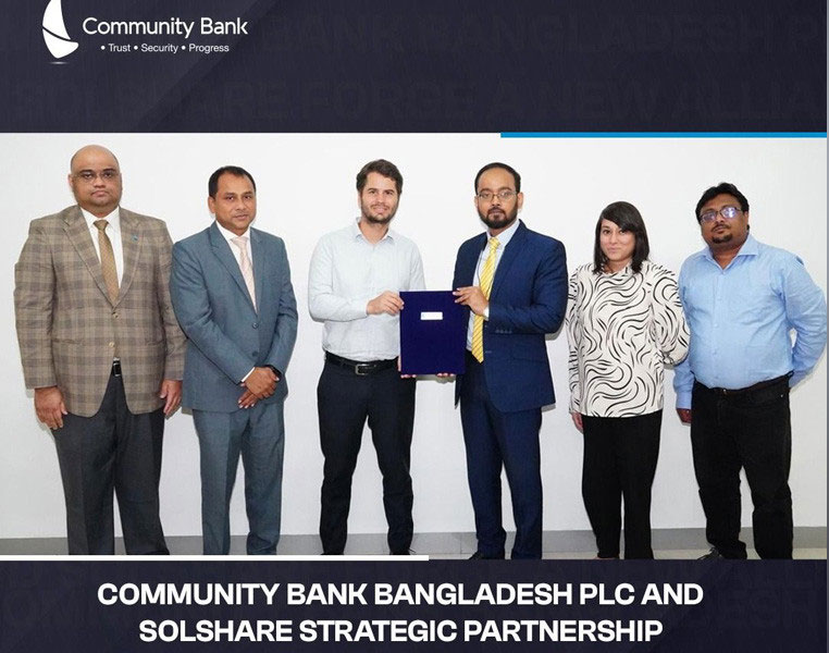 চুক্তিতে স্বাক্ষর করেন কমিউনিটি ব্যাংক বাংলাদেশ পিএলসি’র ব্যবস্থাপনা পরিচালক কিমিয়া সাআদত এবং সোলশেয়ার লিমিটেডের প্রতিষ্ঠাতা ও প্রধান নির্বাহী ড. সেবাস্টিয়ান গ্রোহ।