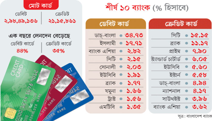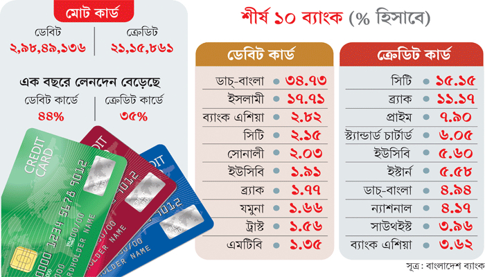 কার্ডভিত্তিক লেনদেনে গ্রাহক আকৃষ্ট করতে বছরজুড়ে নানা প্রচার চালায় অনেক ব্যাংক। ঈদ বা অন্য উৎসবকে কেন্দ্র করে বাড়তি আকর্ষণের জন্য কেনাকাটার বিল পরিশোধে মূল্যছাড় বা ক্যাশব্যাক অফার দেওয়া হয়। তবে শুধু শুধু অফার বা প্রচারের কারণে নয়, ব্যাংকের সেবার ধরন এবং সুবিধা বিবেচনায় নিজের পছন্দের ব্যাংক বেছে নেন গ্রাহক। বাংলাদেশ ব্যাংকের তথ্যে দেখা গেছে, ২০২২ সালে ডেবিট কার্ডের ব্যবসায় শীর্ষে রয়েছে ডাচ্-বাংলা ব্যাংক। আর ক্রেডিট কার্ডে সবার চেয়ে এগিয়ে আছে দ্য সিটি ব্যাংক।