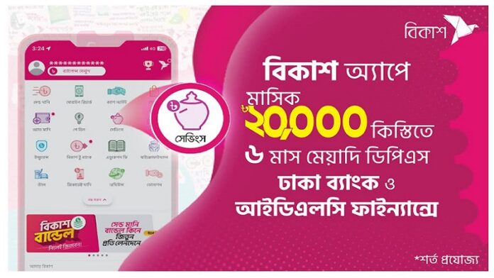 বিকাশ অ্যাপ ব্যবহারকারীরা এখন ঢাকা ব্যাংক ও আইডিএলসি ফাইন্যান্স-এ মাসিক সর্বোচ্চ ২০,০০০ টাকা কিস্তিতে ছয় মাস মেয়াদী ডিপিএস খুলতে পারছেন। এর ফলে যেসব গ্রাহক নির্দিষ্ট লক্ষ্য সামনে রেখে স্বল্প সময়ের মধ্যে কিছু অর্থ সঞ্চয় করতে চান, তাদের জন্য এটি কার্যকর একটি উদ্যোগ হয়ে উঠেছে।