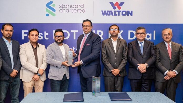 টাকা ও রুপিতে প্রথম আন্তঃসীমান্ত লেনদেন নিষ্পত্তি উপলক্ষে সোমবার (১৮ সেপ্টেম্বর) রাজধানীর এক পাঁচতারকা হোটেলে স্ট্যান্ডার্ড চার্টার্ড ব্যাংক (এসসিবি) এবং ওয়ালটন হাই-টেক ইন্ডাস্ট্রিজ পিএলসি’র মধ্যে এক চুক্তি হয়।
