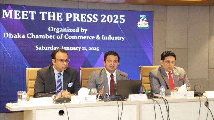 সংবাদ সম্মেলনে ডিসিসিআই ঊর্ধ্বতন সহ-সভাপতি রাজিব এইচ চৌধুরী, সহ-সভাপতি মোঃ সালিম সোলায়মানসহ পরিচালনা পর্ষদের সদস্যরা উপস্থ