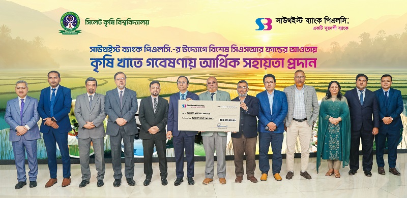 সাউথইস্ট ব্যাংক পিএলসি তাদের করপোরেট সামাজিক দায়িত্ব (সিএসআর) তহবিলের আওতায় সিলেট কৃষি বিশ্ববিদ্যালয়কে গবেষণার উন্নয়নের জন্য বিশেষ আর্থিক সহায়তা প্রদান করেছে।