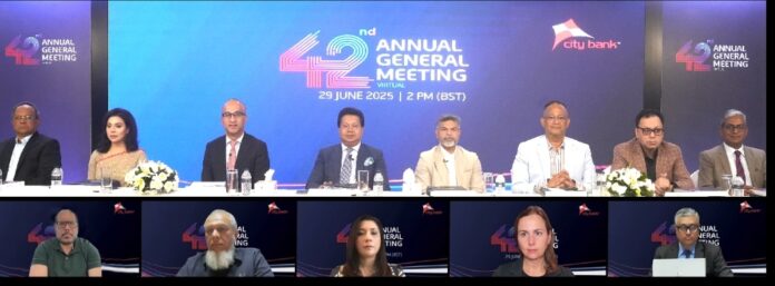 সিটি ব্যাংকের ৪২তম বার্ষিক সাধারণ সভা আজ রোববার (২৯ জুন) ভার্চুয়াল প্ল্যাটফর্মের মাধ্যমে অনুষ্ঠিত হয়। এতে সভাপতিত্ব করেন ব্যাংকের চেয়ারম্যান আজিজ আল কায়সার।
