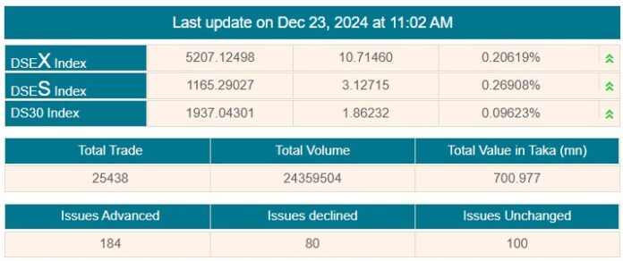 ডিএসইর তথ্য অনুযায়ী, লেনদেন শুরুর প্রথম ঘণ্টা অর্থাৎ সকাল ১০টা থেকে ১১টা পর্যন্ত ডিএসইর প্রধান সূচক ‘ডিএসইএক্স’ ১০.৭১ পয়েন্ট বেড়ে ৫ হাজার ২০৭ পয়েন্টে পৌঁছেছে।