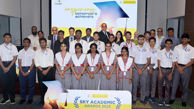 চলতি বছরের এসএসসি পরীক্ষায় অসাধারণ ফলাফল অর্জনকারী ঢাকা শিক্ষা বোর্ডের ২০ শিক্ষার্থীকে সম্মাননা দিয়েছে ইস্টার্ন ব্যাংক পিএলসি (ইবিএল)। ব্যাংকের প্রধান কার্যালয়ে সম্প্রতি আয়োজন করা হয় ‘স্কাই একাডেমিক অ্যাওয়ার্ডস ২০২৫’ শীর্ষক অনুষ্ঠানের।