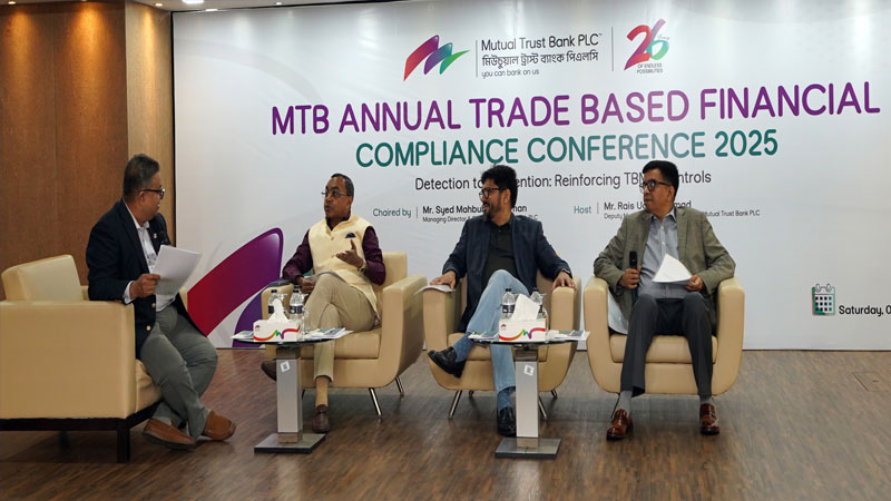 ট্রেড–বেইজড মানি লন্ডারিং প্রতিরোধে সচেতনতা বৃদ্ধির লক্ষ্যে মিউচুয়াল ট্রাস্ট ব্যাংক পিএলসি (এমটিবি) ৬ ডিসেম্বর, ২০২৫ তারিখে ‘এমটিবি বার্ষিক ট্রেড–বেইজড ফিন্যান্সিয়াল কমপ্লায়েন্স কনফারেন্স–২০২৫’ আয়োজন করেছে। অনুষ্ঠানে ব্যাংকের শাখা ও করপোরেট হেড অফিসের ট্রেড–সার্ভিসিং–সংক্রান্ত কর্মকর্তা অংশগ্রহণ করেন।