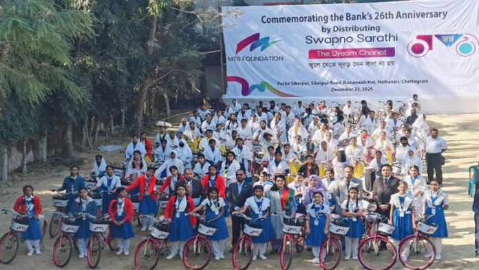 এমটিবি ব্যাংকের ২৬তম প্রতিষ্ঠাবার্ষিকী উপলক্ষে সামাজিক দায়বদ্ধতার অংশ হিসেবে এমটিবি ফাউন্ডেশন চট্টগ্রাম বিভাগের বিভিন্ন স্কুলের সুবিধাবঞ্চিত ও মেধাবী ছাত্রীদের মাঝে বিনামূল্যে সাইকেল বিতরণ করেছে। মঙ্গলবার (৩০ ডিসেম্বর) এক সংবাদ বিজ্ঞপ্তির মাধ্যমে এ তথ্য জানানো হয়।