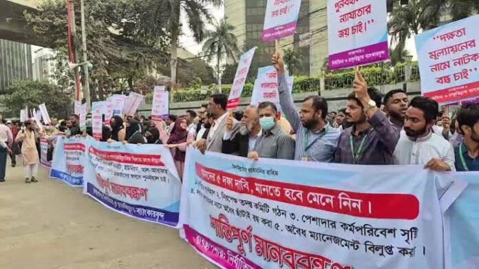 মানববন্ধনে বক্তারা অভিযোগ করেন, গত ৫ আগস্টের পর কোনো ধরনের নিয়মনীতি বা প্রাতিষ্ঠানিক প্রক্রিয়া অনুসরণ না করেই প্রায় ১০ হাজার কর্মকর্তা-কর্মচারীকে চাকরি থেকে বাদ দেওয়া হয়েছে। তারা বলেন, এ ধরনের সিদ্ধান্ত শুধু ব্যক্তিগত জীবনে সংকট তৈরি করেনি, বরং দেশের ব্যাংকিং খাতের স্থিতিশীলতাকেও ঝুঁকির মধ্যে ফেলেছে।