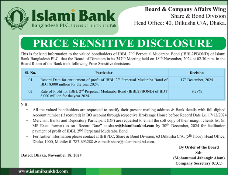 Price Sensitive Disclosure of Islami Bank