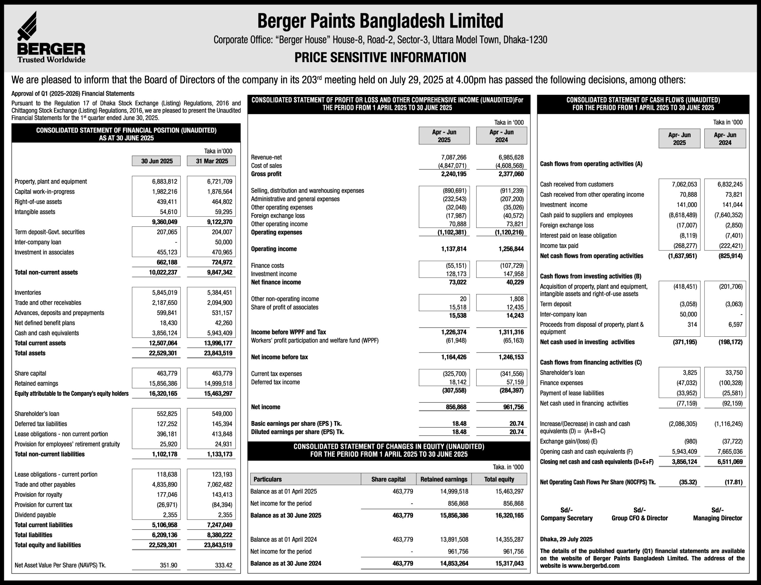 Home পিএসআই Price Sensitive Information of Berger piants Bangladesh Limited