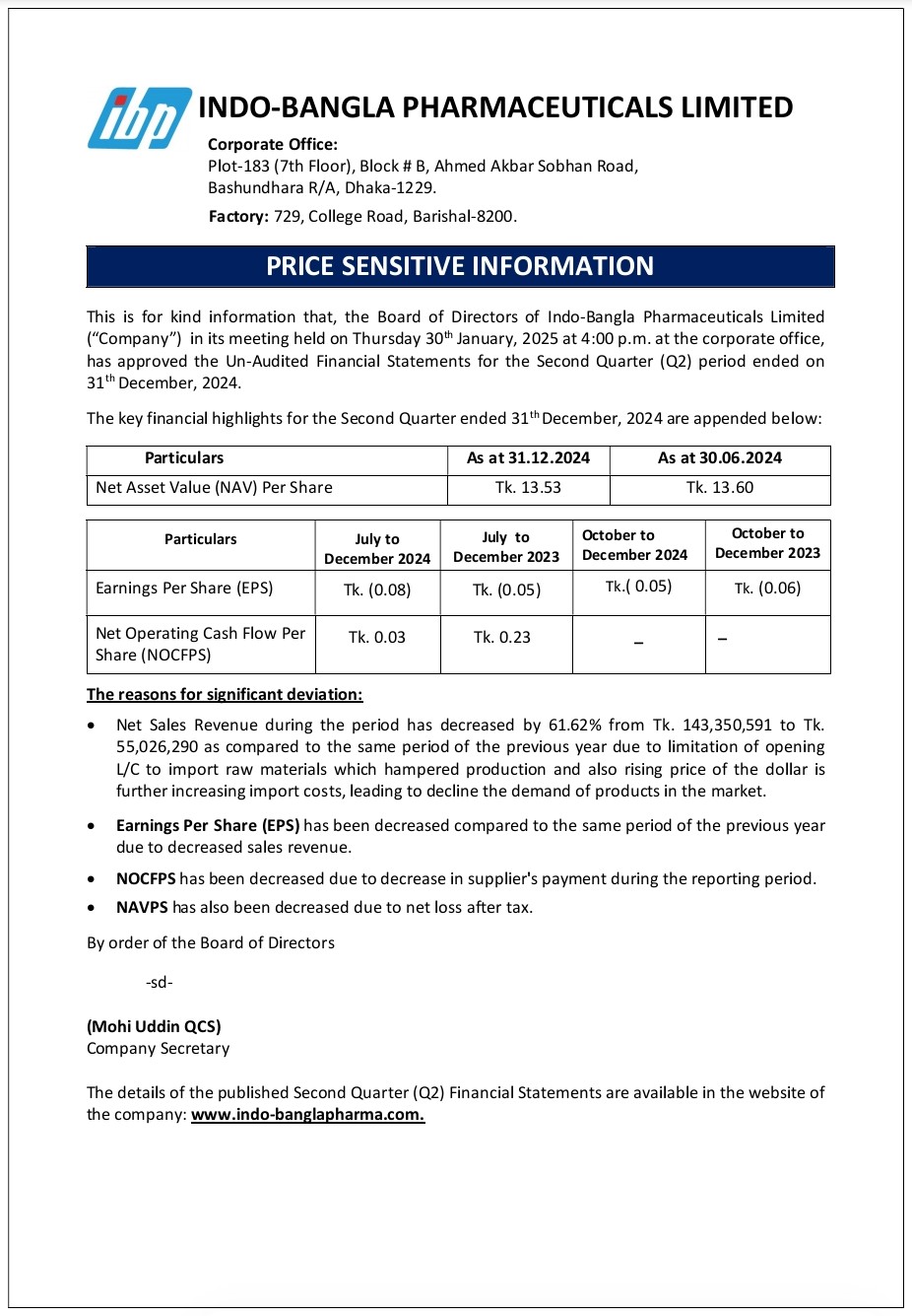 Price Sensitive Information of Indo Bangla Pharmaceuticals Ltd