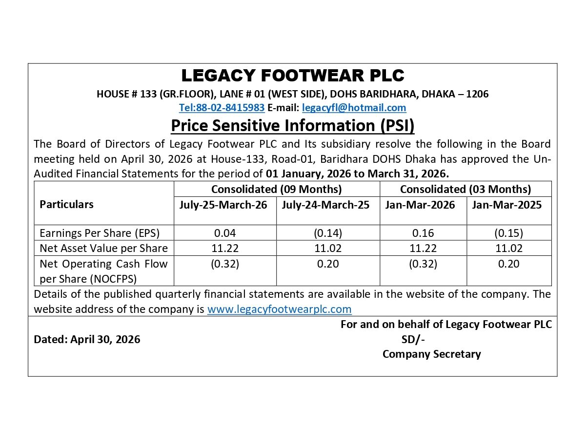 শেয়ারবাজারে তালিকাভুক্ত কোম্পানি কেডিএস এক্সেসরিজ লিমিটেড গত ৩১ মার্চ, ২০২৬ তারিখে সমাপ্ত তৃতীয় প্রান্তিকের (জানুয়ারি’২৬-মার্চ’২৬) অনিরীক্ষিত আর্থিক প্রতিবেদন প্রকাশ করেছে।