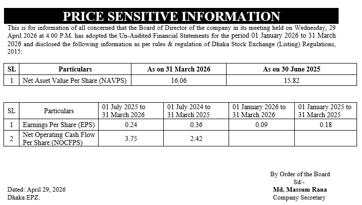 Home পিএসআই Price Sensitive Information of Queen South Textile Mills Ltd. পিএসআই Price Sensitive Information of Queen South Textile Mills Ltd. April 29, 2026 Facebook Twitter Pinterest WhatsApp Facebook Twitter Pinterest WhatsApp Previous articleUn-Audited third Quarterly Financial Statements of IT Consultants PLC.Next articlePrice Sensitive Information of KDS Accessories Limited Toffazel Hossainhttp://www.banijjosangbad.com RELATED ARTICLES পিএসআই Price Sensitive Information of KDS Accessories Limited admin - April 29, 2026 0 Read more পিএসআই Un-Audited third Quarterly Financial Statements of IT Consultants PLC. Toffazel Hossain - April 29, 2026 0 Read more পিএসআই Price Sensitive Information of Bangladesh General Insurance Company PLC. admin - April 29, 2026 0 Read more LEAVE A REPLY Cancel reply Please enter your comment! Please enter your name here You have entered an incorrect email address! Please enter your email address here Save my name, email, and website in this browser for the next time I comment. Δ - Advertisment - Price Sensitive Information of KDS Accessories Limited পিএসআই admin - April 29, 2026 0 Read more Price Sensitive Information of Queen South Textile Mills Ltd. পিএসআই Toffazel Hossain - April 29, 2026 0 Read more Un-Audited third Quarterly Financial Statements of IT Consultants PLC. পিএসআই Toffazel Hossain - April 29, 2026 0 Read more Price Sensitive Information of Bangladesh General Insurance Company PLC. পিএসআই admin - April 29, 2026 0 Read more Load more Recent Comments