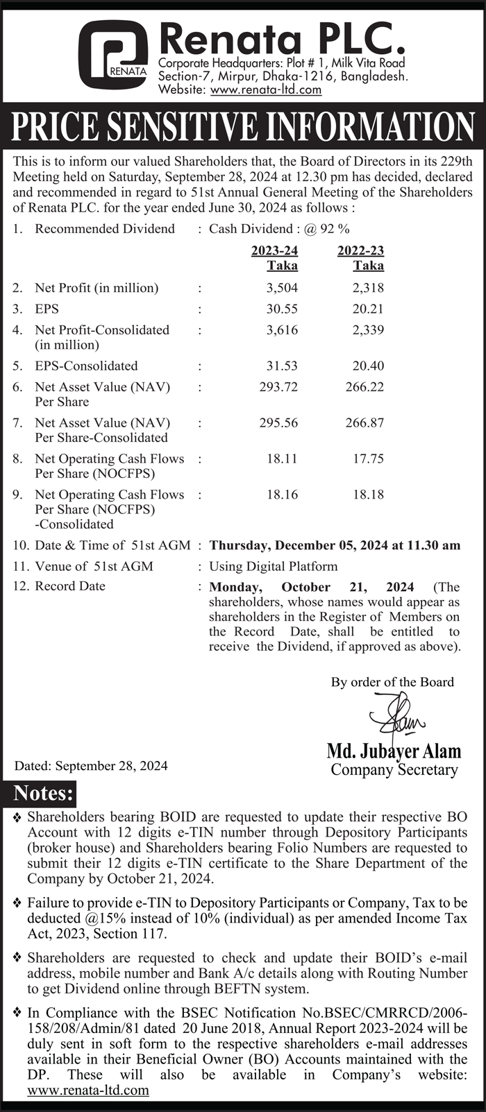Price Sensitive Information of Renata PLC