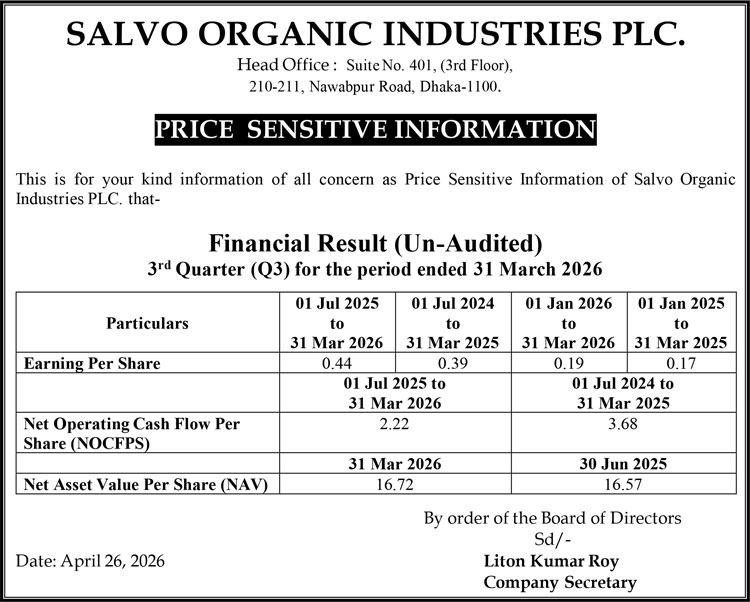শেয়ারবাজারে তালিকাভুক্ত কোম্পানি স্যালভো কেমিক্যাল ইন্ডাস্ট্রি গত ৩১ মার্চ, ২০২৬ তারিখে সমাপ্ত তৃতীয় প্রান্তিকের অনিরীক্ষিত আর্থিক প্রতিবেদন প্রকাশ করেছে।