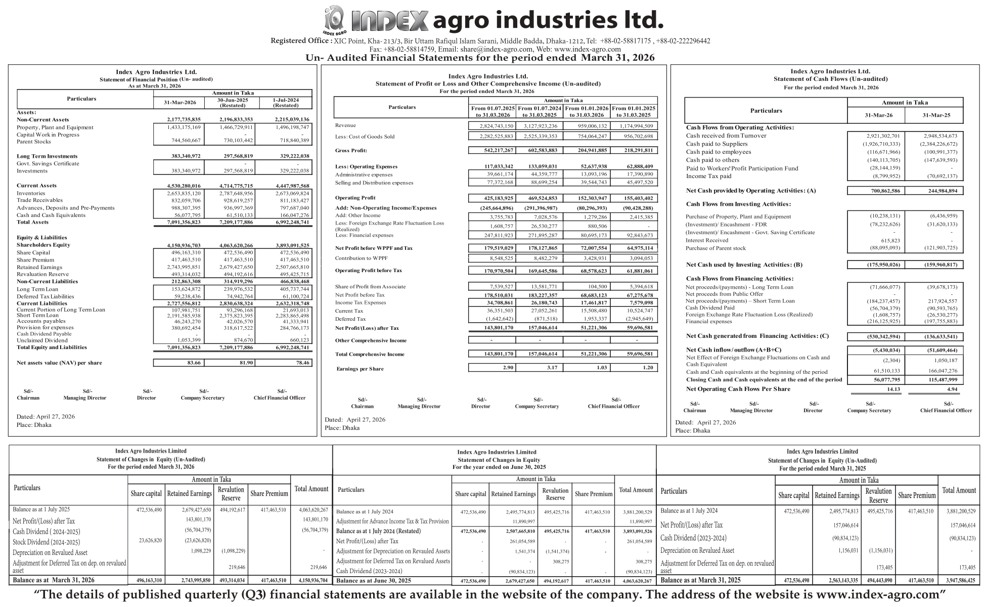 শেয়ারবাজারে তালিকাভুক্ত কোম্পানি ইনডেক্স এগ্রো ইন্ডাস্ট্রিজ লিমিটেডের পরিচালনা পর্ষদ তৃতীয় প্রান্তিকের (জানুয়ারি,২৬ মার্চ,২৬) অনিরীক্ষিত আর্থিক প্রতিবেদন প্রকাশ করেছে।